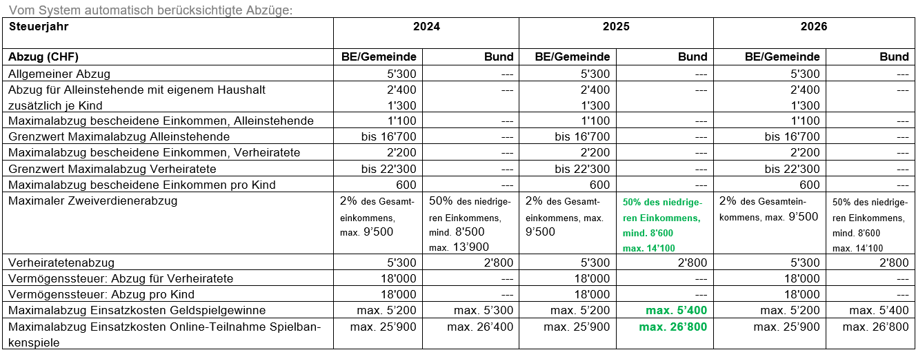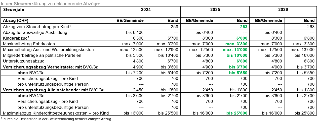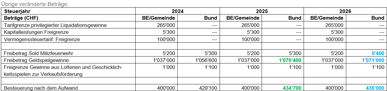 Das Eidgenössische Finanzdepartement (EFD) passt sämtliche Tarifstufen und Abzüge jährlich an den Landesindex der Konsumentenpreise an. Massgebend ist dabei jeweils der Indexstand am 30. Juni vor Beginn der Steuerperiode (vgl. Art. 14 Abs. 6 und Art. 39 Abs. 2 DBG). Somit können die angepassten Beträge aufgrund des im Vergleich zu den Kantons- und Gemeindesteuern unterschiedlichen Indexstandes auch unterschiedlich ausfallen.