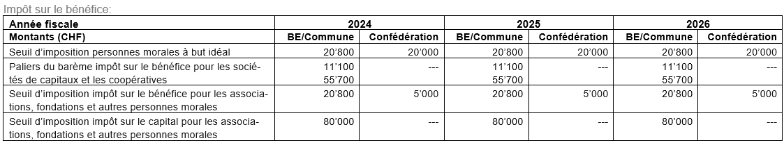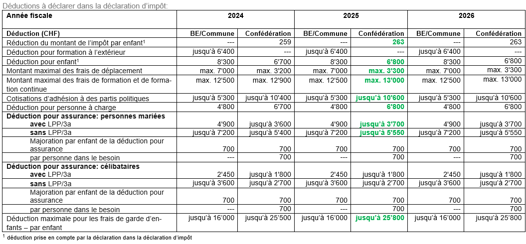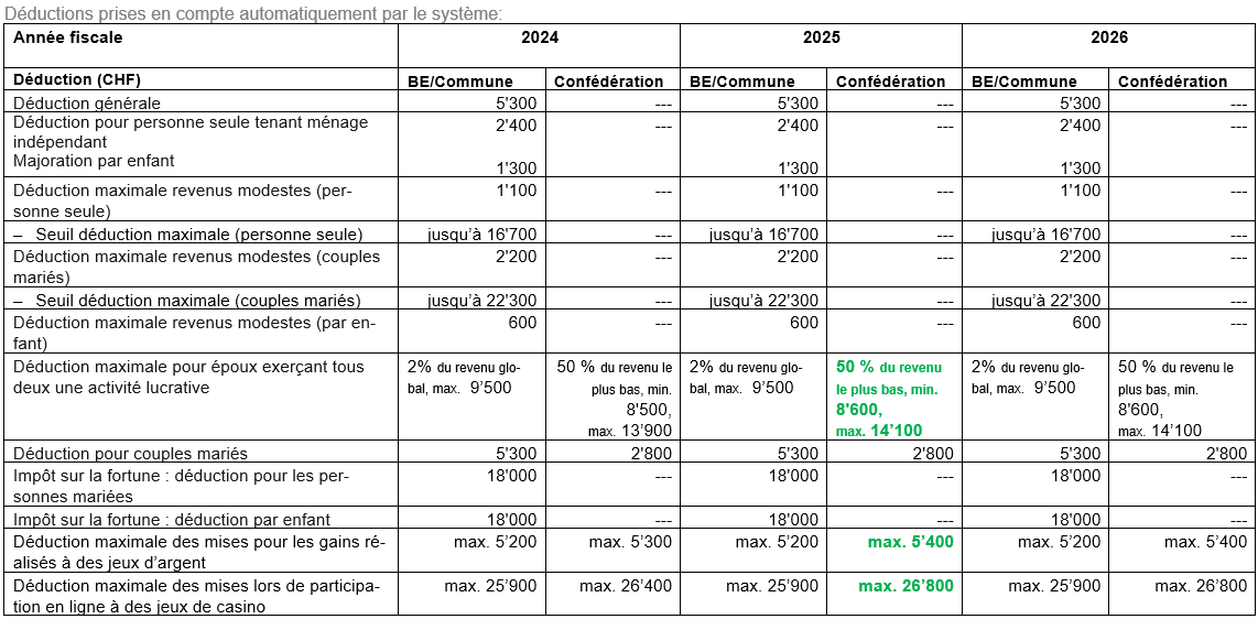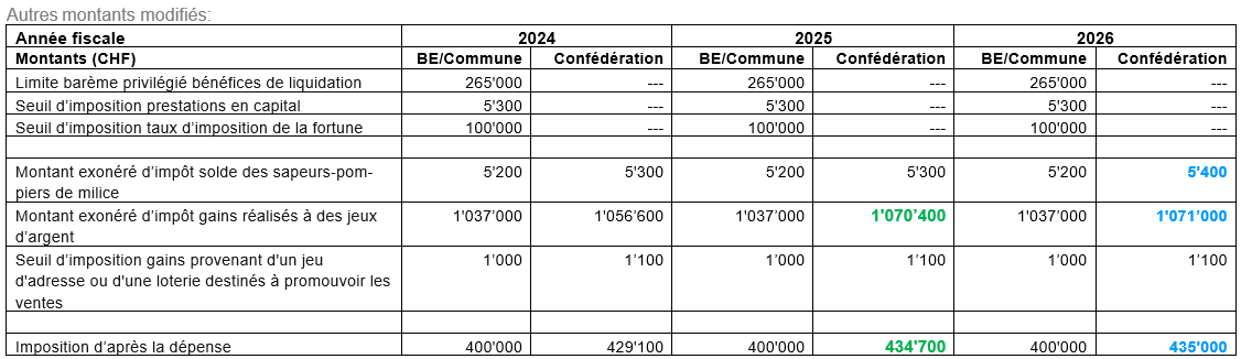 Le Département fédéral des finances (DFF) adapte chaque année l’ensemble des paliers du barème et les déductions à l’indice suisse des prix à la consommation. Le niveau de l’indice au 30 juin précédant le début de la période fiscale est déterminant (cf. art. 14, al. 6 et art. 39, al. 2 de la loi fédérale du 14 décembre 1990 sur l’impôt fédéral direct, LIFD ; RS 642.11). Ainsi, les montants adaptés peuvent être différents en raison de la différence d'indice par rapport aux impôts cantonaux et communaux.