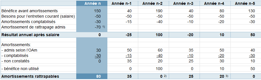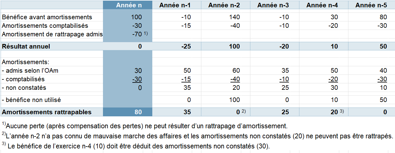 Le montant des amortissements à rattraper est fonction des taux d'amortissement admis par l’OAm au cours de l'année considérée. Les amortissements à rattraper doivent en principe être retranchés du bénéfice imposable de l'exercice au cours duquel l'amortissement n'a pas été constaté. Cette opération ne concerne pas les bénéfices imposables résultant de la dissolution comptable de réserves latentes ni, pour les entreprises de personnes, ceux qui sont nécessaires à la couverture des besoins courants (exemple 4.1).